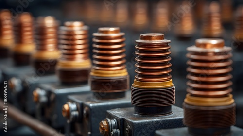Close up of copper coiled electrical components in industrial manufacturing line