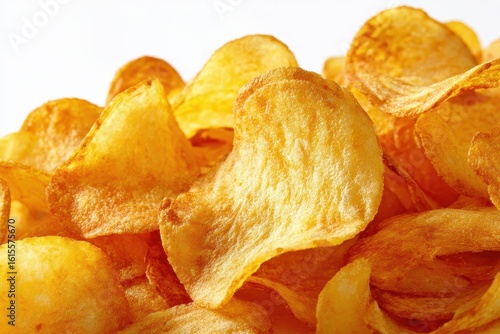 Close up of crispy potato chips on a white background