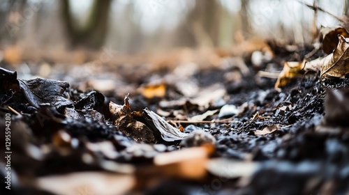 Close up of dried leaves and twigs on forest floor creating a sense of decay in nature : Generative AI