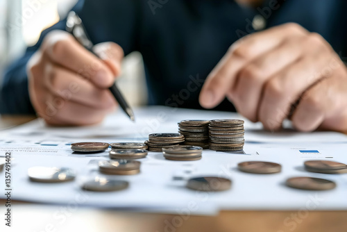 Close Up of Financial Growth Concept with Stacks of Coins and Blurred Figure Holding a Pen on Financial Documents in Soft Lighting