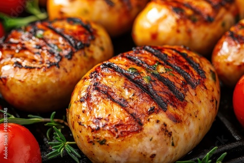 Close up of Grilled Italian Sausage with Tomatoes and Rosemary on a Black Grill Pan Perfect for Summer Cookout and Barbecue with a Delicious Flavor and Aroma