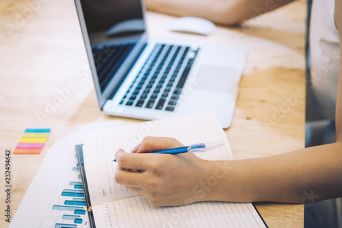 Close up of hand young business women working for new projects and taking notes in notebook at office.Teamwork successful Meeting Workplace strategy Concept.g business women working for new projects.