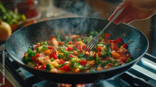 close up of hands cooking vegetables in a wok on a stove at home, using fork and spoon, colorful vegetable mix, healthy breakfast, high quality photo, blurred background