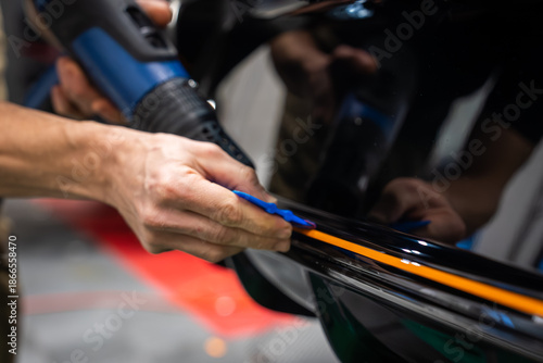 Close up of hands in an auto service bay applying an orange vinyl stripe on a glossy black panel, using a heat gun and blue squeegee under bright diffused lighting.
