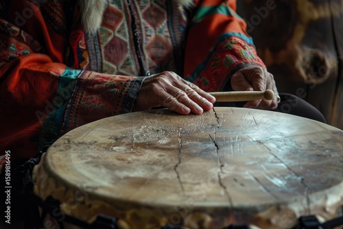 Close up of hands playing a large wooden drum with a drumstick, during a traditional ritual ceremony