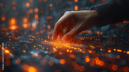 Close up of human hand touching abstract screen with binary code. 3d rendering. Finger touching fingerprint on computer screen. Fingerprint scan concept.