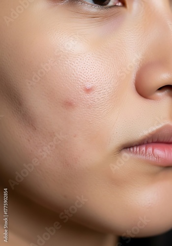 Close up of human skin with blemishes face cheek