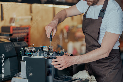 Close up of man hands repairing coffee machine in a workshop