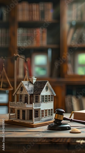 Close up of miniature house and gavel on table. The scene captures the concept of real estate law or home slightly worn out.