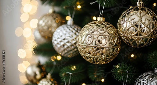 Close up of ornate gold and silver christmas tree ornaments with soft bokeh lights in the background creating a festive and elegant holiday atmosphere