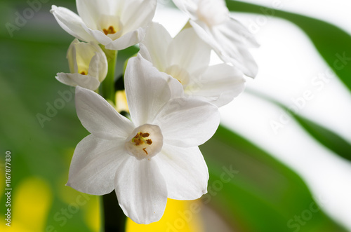 Close up of Paperwhite Narcissus Flowers on Colorful Background