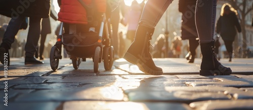 close up of people walking in the street, one person is wearing long pants and black shoes, another woman has her feet raised on an empty stroller Generative AI