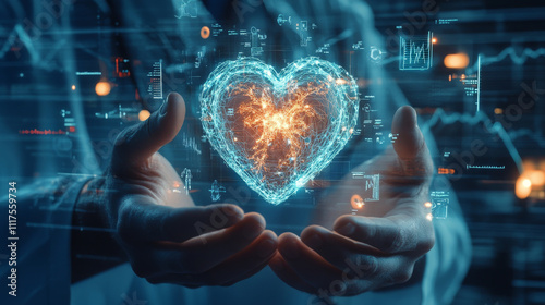 Close up of physician hands gently cradling glowing heart symbol, representing care and technology in healthcare. background features digital data and graphs