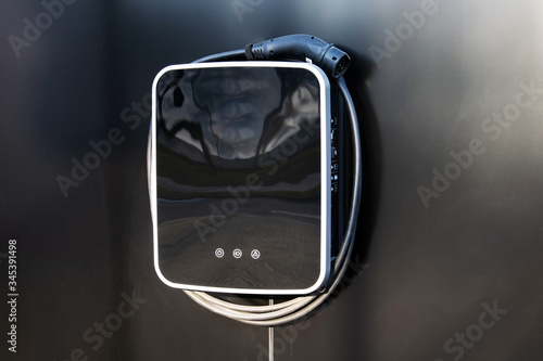 Close up of power supply plugged into. Electric car charging on parking lot with electric car charging station on city street.