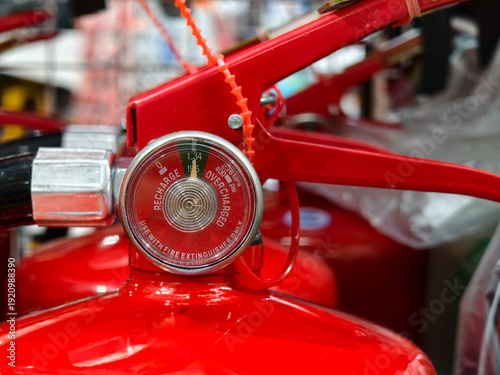 Close up of Pressure Gauge on Red Fire Extinguisher Tank. fire safety equipment, industrial emergency preparedness, workplace safety regulations, and building maintenance services.