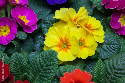 Close up of Primula in various colours