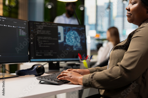 Close up of programmer writing code, developing deep learning APIs. Tech startup office employee troubleshooting application errors using artificial intelligence on computer