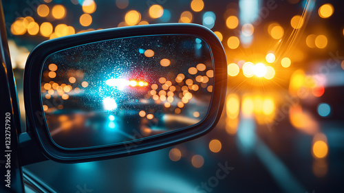 Close up of rearview mirror reflecting colorful bokeh lights and emergency vehicle lights at night. scene captures dynamic urban atmosphere with sense of urgency