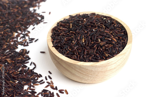Close up of rice berry in wooden bowl on white background