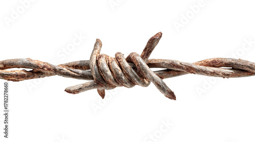 Close up of rusty barbed wire with sharp points isolated on transparent background