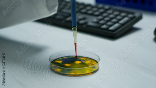 Close up of scientist using micropipette for analysing blood sample putting in petri dish. Team of researchers examining virus evolution using high tech for vaccine development against covid19