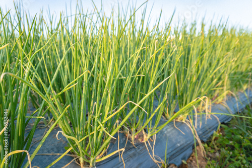 Close up of shallot plants growing in cultivated field, showcasing fresh green leaves, agricultural pattern, and organic farming in tropical environment.