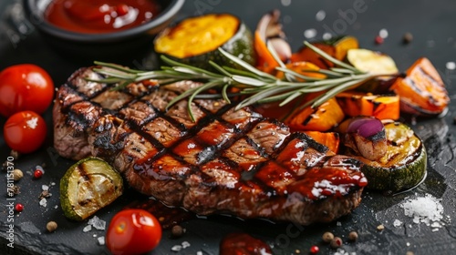 Close up of steak, vegetables, and sauce on black plate