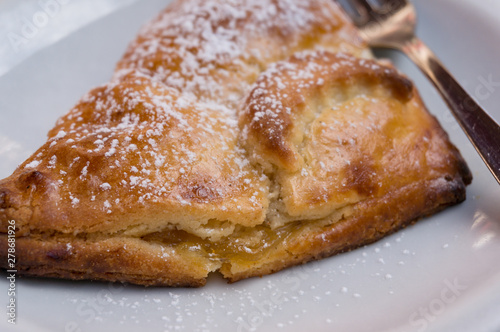 Close up of tasty hand made apple pie with sugar powder decoration