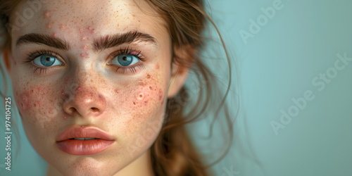 Close up of teenage girl face with red pimples on skin. Acne therapy, inflammation on face and problem skin. Facial care, skin care routine and hygiene. Rosacea and couperose. Cosmetic and beauty conc
