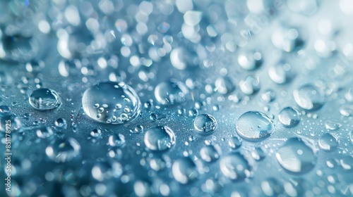 Close up of water droplets on a blue surface. The droplets are round and glistening, with some reflecting light. The image is abstract and can be used for a variety of purposes.