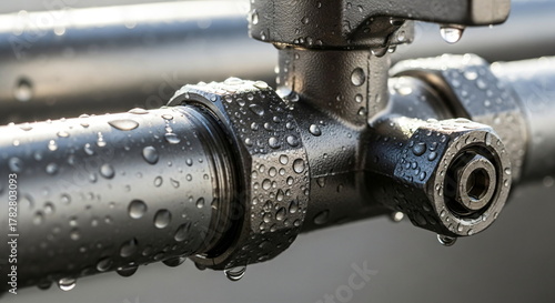 Close up of water drops on a metallic surface. Condensation on a cold metal pipe or railing. Wet shiny texture for abstract background footage.