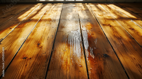 close up of water stained wooden floorboards with sunlight casting shadows, creating warm atmosphere