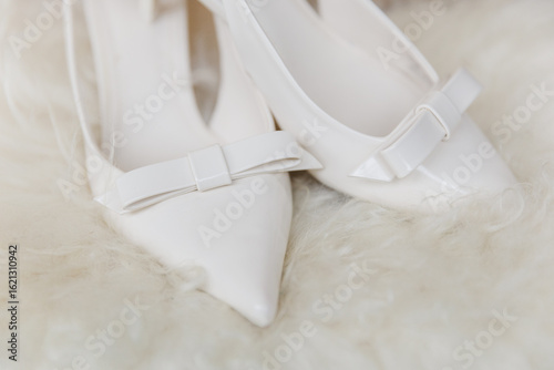 Close up of white wedding shoes with a bow tie on them
