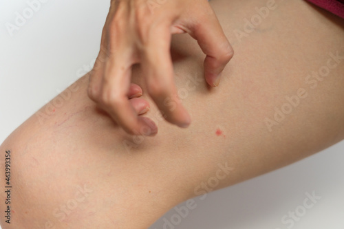 Close up of woman scratching the itch on her leg on isolated whtie background. Dry skin, dermatitis, irritation, animal, food, allergy, insect bites concept.
