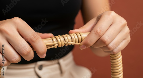 Close up of woman's hands weaving wicker into basket handle, crafting handmade rattan basket with detailed careful technique on brown background