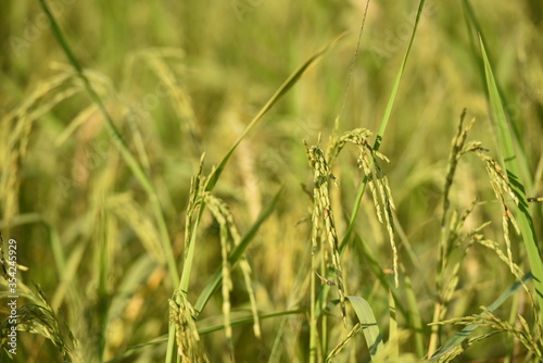 close up of yellow green rice field.
