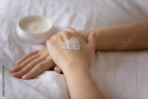 Close up of young Caucasian woman apply nourishing body cream on dry hands for soft healthy skin, female use moisturizing butter or balm beauty product, do daily procedures at home, skincare concept