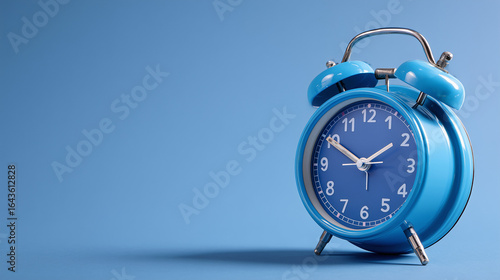 Close up one blue alarm clock over blue background.