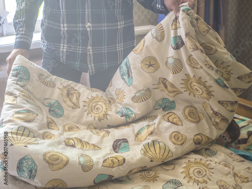 close up person making a bed with blanket
