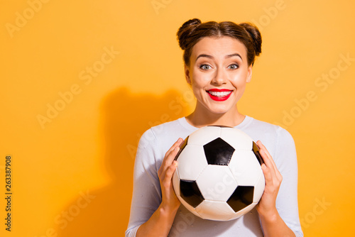 Close up photo beautiful amazing hairdo she her lady hold hands arms leather round ball captain cheerleader pray for win favorite team wearing casual white pullover isolated yellow background