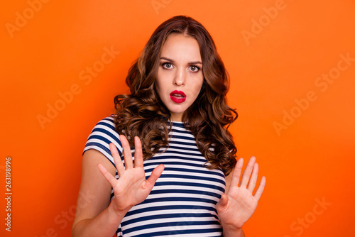 Close up photo beautiful she her lady red lipstick pomade ask stand still calm down pull over make pause off quit wear casual striped white blue t-shirt clothes isolated orange bright background