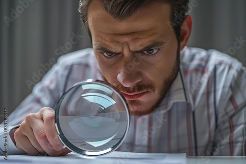 Close up photo of a male Caucasian businessman scrutinizing a policy document using a magnifying glass in an office setting