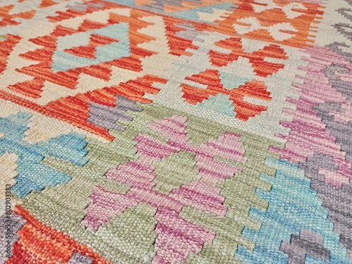 Close up photo of handmade wool Afghanistan Kilim Rug Carpet. Very beautiful textile design and nice motif. Made of wool and natural dyes