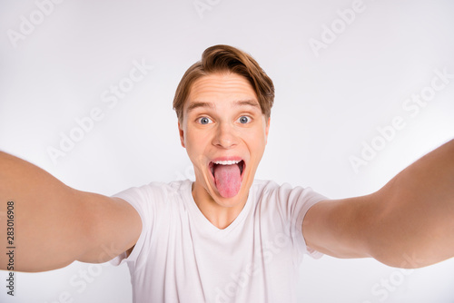 Close up photo of student guy making selfies weekend mood wear casual outfit isolated white background