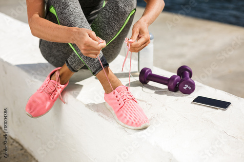 Close up photo of woman hands and legs in pink sneakers sitting and tie shoelaces with purple dumbbells, cellphone and bottle of water nearby