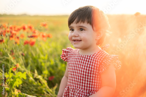 close up portrait beautiful happy baby girl in red dress smiling on field of poppies at summer sunset