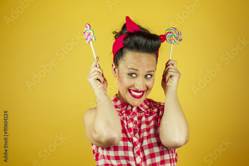 Close up portrait beautiful pin up girl with colorful lollipops