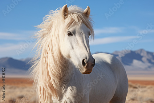 Close up portrait of a butiful white horse made in natural habitat conditions on a plain hiils background. Banner, poster, postcard, wallpaper