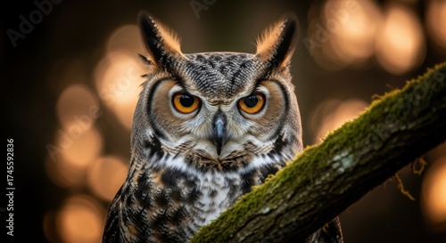 Close Up Portrait of a Fierce Great Horned Owl Perched on a Mossy Branch