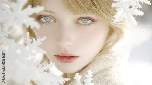 Close up portrait of a young woman with pale skin and light blonde hair, framed by delicate ice crystals. Soft, ethereal lighting enhances her